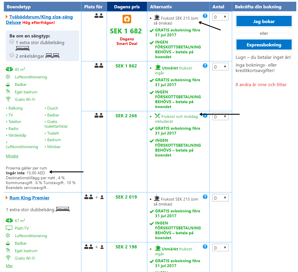 Om man inte har koll på denna biten, kan hotell och restaurangnotan bli bra mycket dyrare än man tänkt sig. Totalt läggs det på skatter och avgifter på 20%. På hotellet lägger man ofta på ytterligare cirka 40, 15 AED, kronor per natt som kallas destinationstillägg. 4 % Kommunavgift, 6 % Turistavgift, 10 % Boendets serviceavgift. Se till att dessa ingår när ni bokar hotellet. Se bilden 3#.