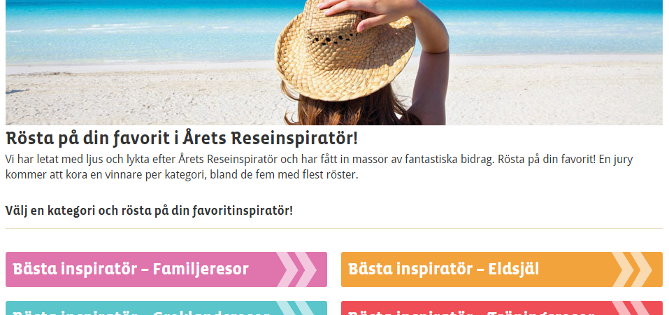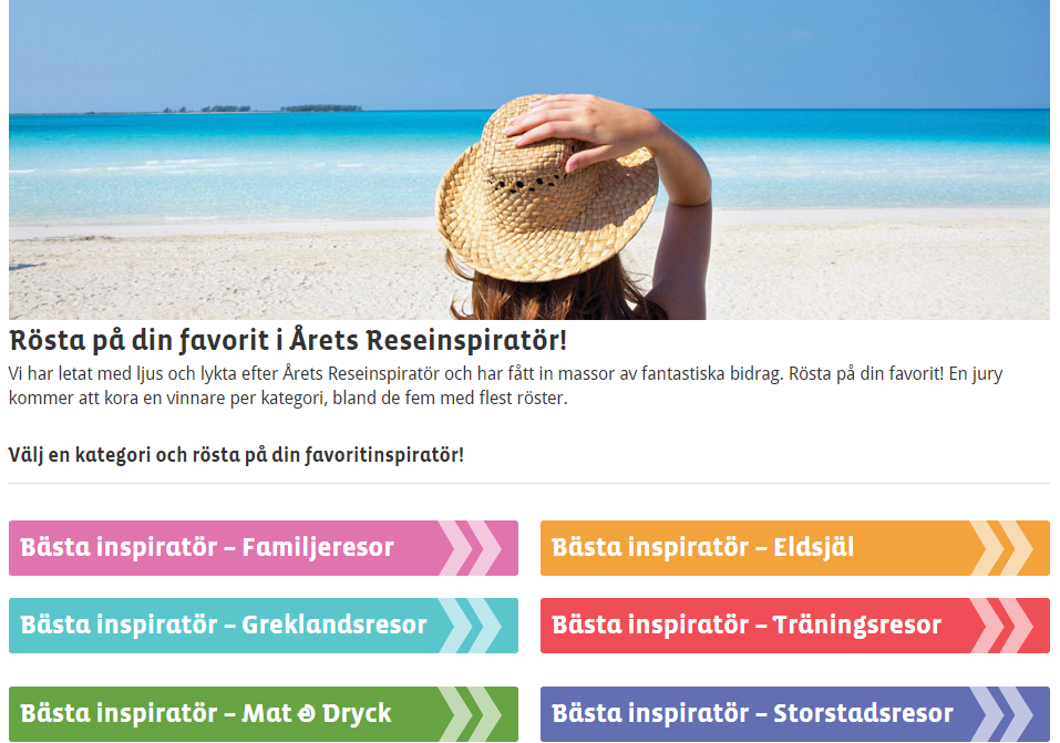 De övriga kategorierna är Familjeresor, Eldsjäl, Greklandsresor och Träningsresor. Om du vill vara med och påverka och rösta på din favoritblogg eller ditt favoritinstagramkonto gör du det genom att gå in på länkarna här ovan eller ta dig vidare genom bilderna i vänsterkolumnen.