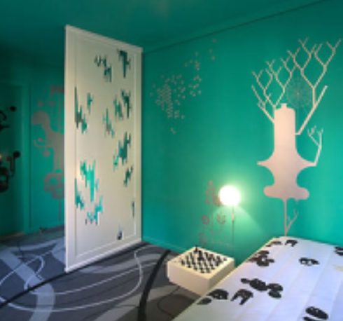 På Hotel Fox i Köpenhamn har man låtit 21 konstnärer designa hotellets 61 rum. Ett av dem, kallat ”Room 209 – North vs. South”, ser vi här.