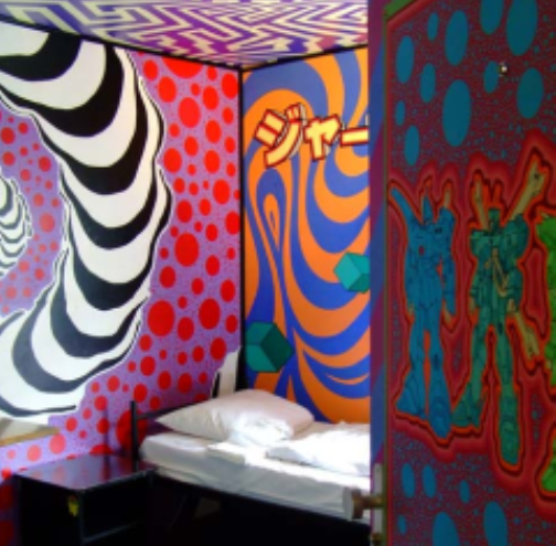 Rummet ”Flying Bed” på Propeller Island City Lodge i Berlin har konstnären Lars Stroschen skapat en synvilla vilken gör att det ser ut som att sängen svävar. Dessutom lutar hela golvet.