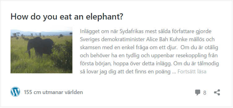 Linda på 155cm är bloggaren som ständigt utmanar oss läsare och resenärer att tänka till lite mer när det kommer till medmänniskor och medvetet resande. Inte helt oväntat blir mitt favoritinlägg denna månad ett av Lindas inlägg. ”How do eat an elephant”. Välformulerat, genomtänkt och ger en tankeställare. In och läs.