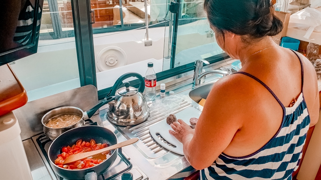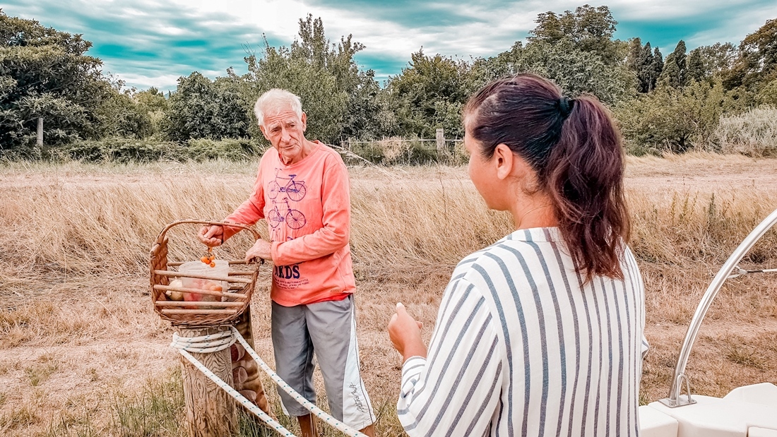 Vi bestämmer oss för att ta det lugnt, vila och bara njuta av timmarna på båten. Vi kokar soppa på en spik. Kanske vi borde handlat mat i Hompes, men det blev inte så. Så det blir kvällsmat på vin, chips, salami, marmelad och kex. Men vi är hur nöjda som helst. Bara man har vin så klarar man sig en stund. På morgonen när vi är på väg att lägga ut, kommer en äldre herre och erbjuder nyskördade grönsaker. Självklart ska vi ha lite.