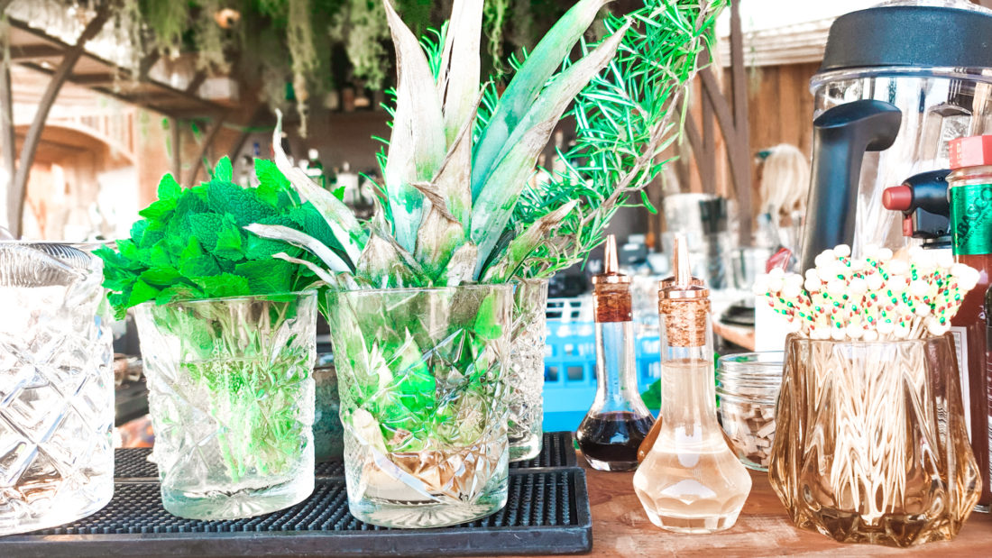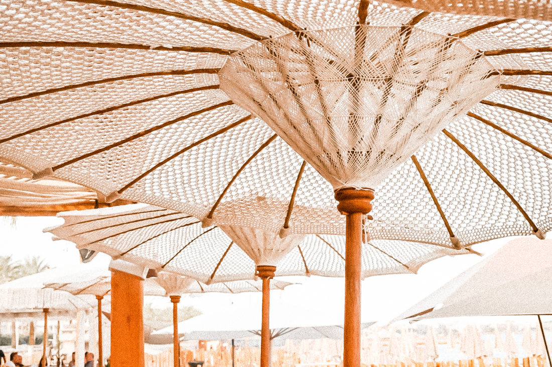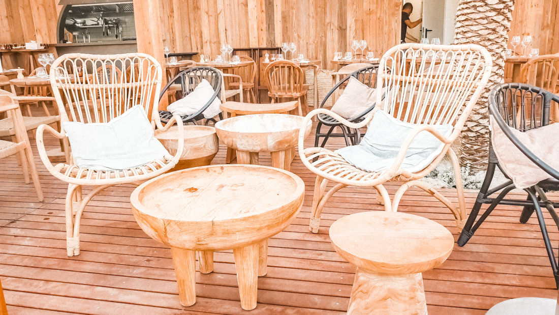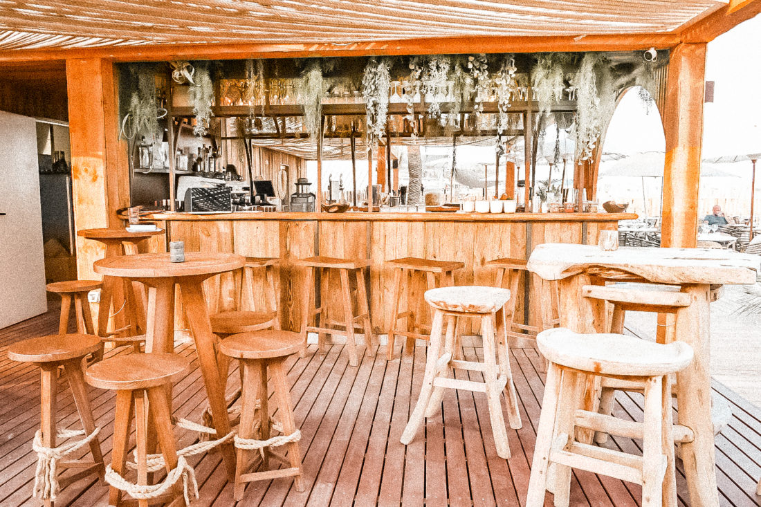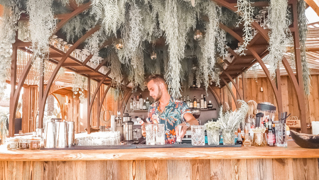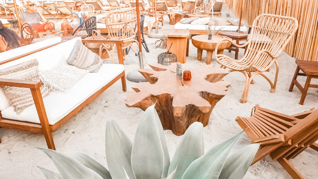 Jag är ju lite svag för allt som är bambu. Och denna lilla bit av stranden är inhägnad med just det. Att vi har hamnat på ett helt nyöppnat ställe förstår vi ganska snabbt. Så nytt att de bara haft öppet tre dagar. Varenda detalj är genomtänkt och varenda accessoar är placerad med omtanke. De virkade parasollen, de stora kaktusarna, lyktorna, kuddarna och de specialdesignade träborden.