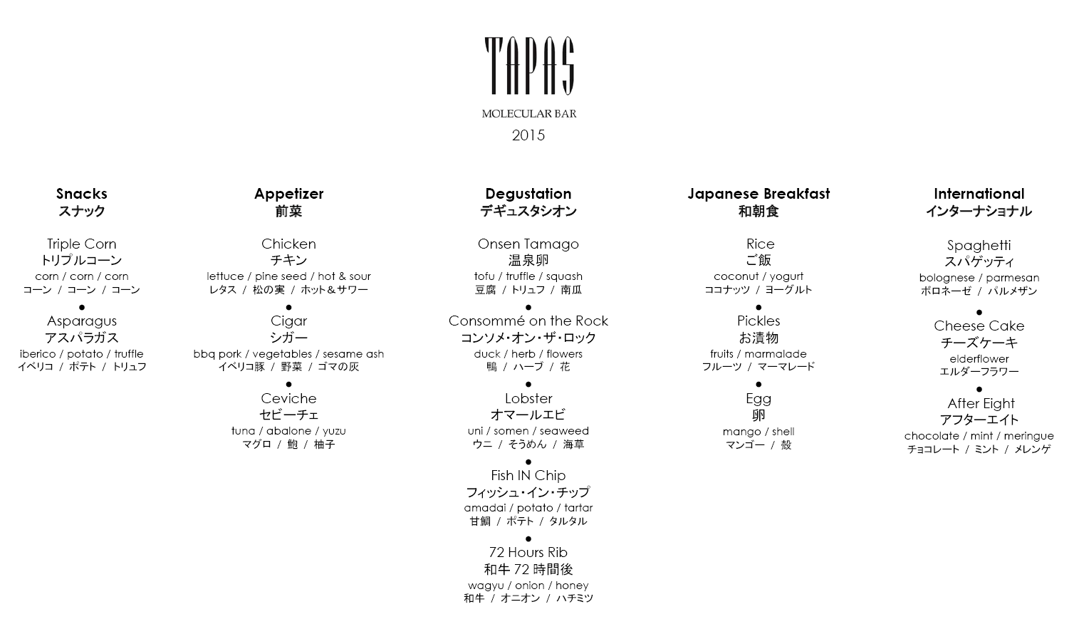 Tapas Molecular bar. 38e våningen på Mandarin Oriental i Tokyo, Shibuya Districtet. En liten bar med åtta plaster. Två kockar, en Japan, en Kanadensare. Två sittningar per kväll. Sexton rätter. OCH en verktygslåda. Där har ni upplägget och början på en fantastisk kväll och upplevelse.