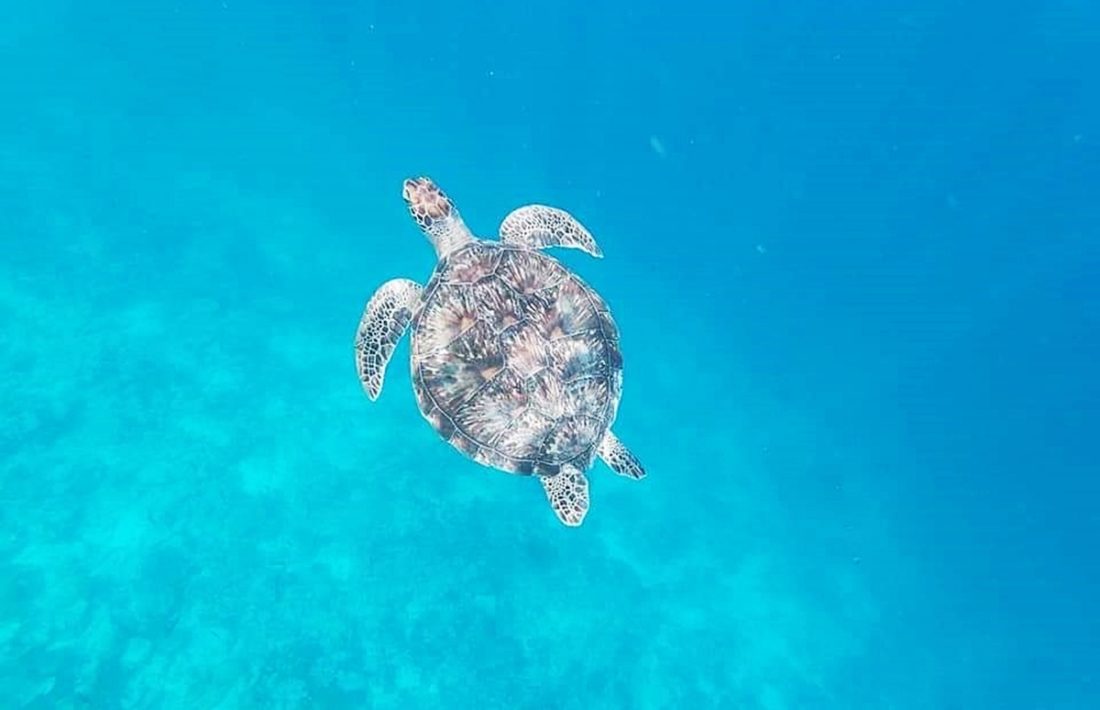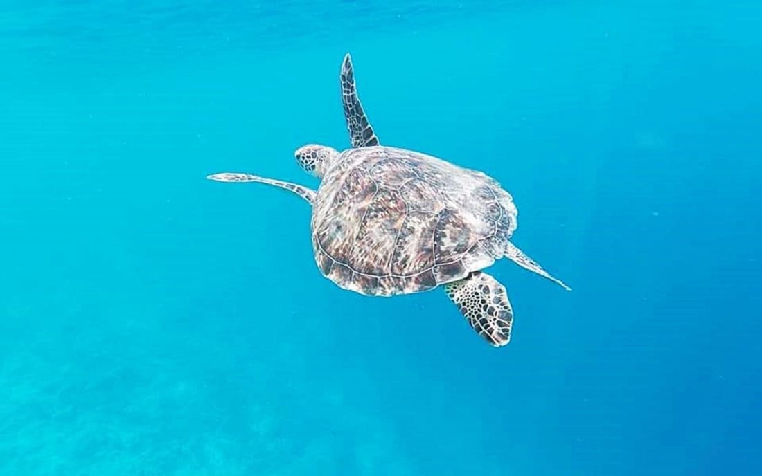 När båten puttrar vidare till vårt andra stopp, saktar båten plötsligt ner. En liten bonus. Tio meter från oss simmar en familj delfiner. Eftersom det inte ingår i vår tur, bli det bara ett kort stopp och sedan åker vi vidare till vårt nästa äventyr. Sköldpaddor. Jag vet inte varför, som om jag inte hade nog med snorkelutrustningen, men av någon anledning gör jag som alla andra, och tar också på flytvästen. Ovanpå våtdräkten. Jag studsar i vattnet och har förhoppningar om att det ska gå bättre än förra gången. Men inget sådan händer. Som en skadad fågel kämpar jag i vattnet med allt.