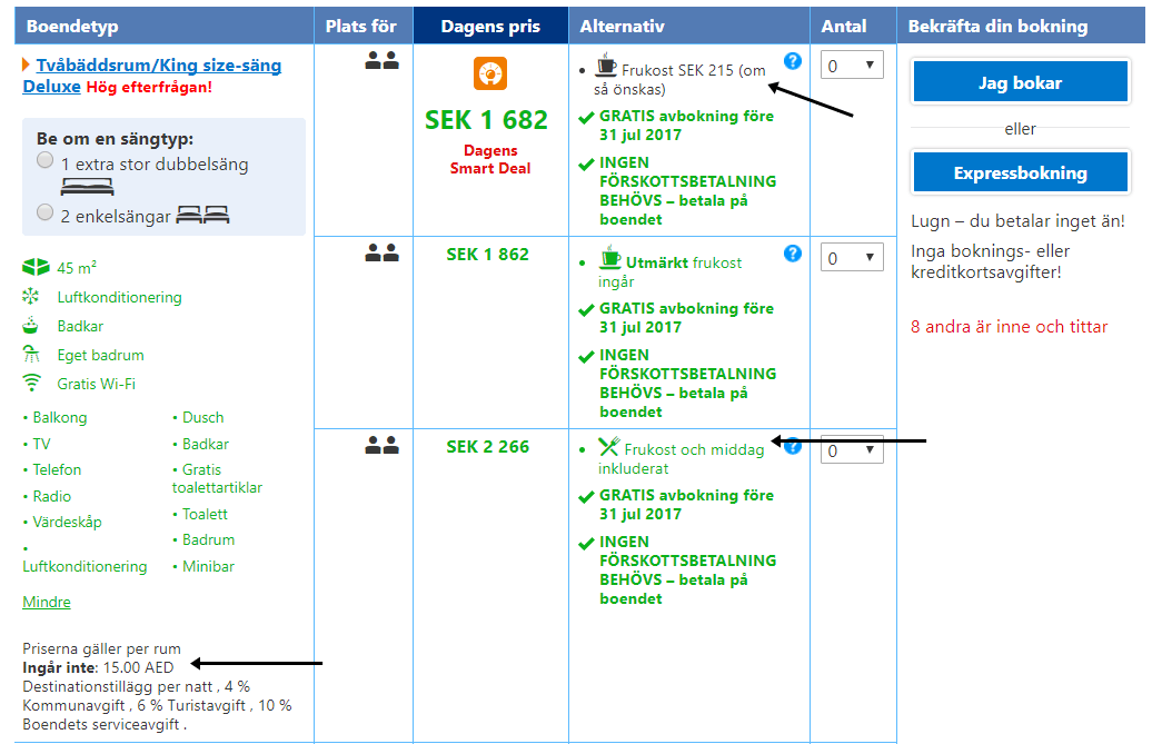 Vi bokar nästan alltid hotell via Booking, ibland direkt via hotellet och ibland på Agoda. Idag vill jag visa er alternativen som vi hade när vi bokade våra hotell inför resan till Abu Dhabi på Booking. Jag visar de olika alternativen vi hade att välja på och hur olika totalpriserna hade blivit för samma hotell. Tänk på att det nästan alltid tillkommer 20% skatt på priset som anges på Booking när det gäller Abu Dhabi. Jag ger er prisskillnaderna på samma hotell beroende på vilket alternativ man bokar. De två hotellen nedan är hotellen vi bodde på när vi var i Abu Dhabi. På vårt andra hotell sparade vi 575 kronor per person och natt, tack vare att vi läste det finstilta på Booking.