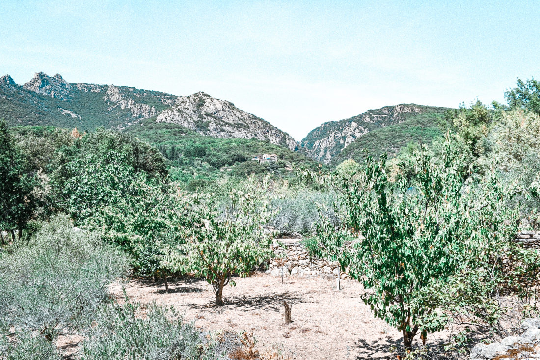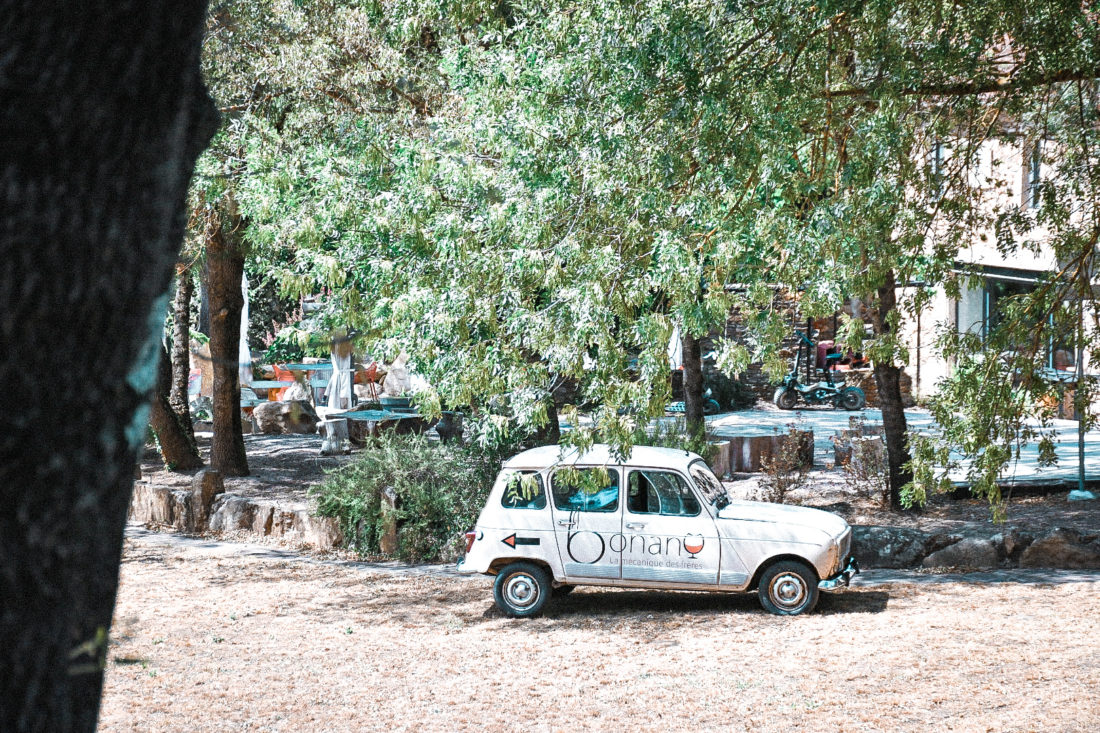 Så jag börjar leta efter öppna restauranger i området på Google Maps. Men vi hoppas inte på för mycket. Vi har under våra veckor här, upptäckt att det mesta i Frankrike är stängt mellan två och sex på eftermiddagen. Efter en liten stund, hittar jag så en som verkar ha öppet. Och inte långt efter Olargue, börjar skyltarna dyka upp. Men ingen by. Helt plötsligt passerar vi en grusväg som verkar slingra sig nerför backen och som vi lätt hade kunnat missa. Eller jo, vi missade den faktiskt. Jag såg den precis när vi for förbi. Så, mannen gör en usväng och så er vi på väg ner mot en liten gård.