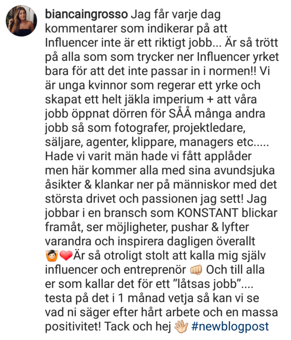 Med den inställningen skulle vi behöva lägga ner alla konstnärliga och kreativa utbildningar i landet. Vi skulle inte behöva fotbollsutbildningar, dansskolor, konstskolor och musikskolor. För det är väl inget nytt att många vill läsa ämnen som de är passionerade för. Att pusha alla till att bli sjuksköterskor, när inte alla är lämpade för det, är väl knappast någon god ide. Men mer upprörd blir jag när jag hamnar på Bianca Ingrossos Instagram, där många ger henne kritik för att hon är just influenser. Inlägget har skapat över 1 400 kommentarer och tack och lov är de flest peppande och positiva. Men så har vi de där som alltid ska döma, alltid kritisera och som kanske egentligen inte är så insatta i vad yrket innebär.