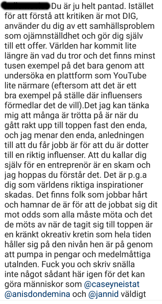 Varför är det okej för @Jannid att kalla sig influencer, se kommentar två, men inte Bianca? Något som många också glömmer är att inte alla influencers är modebloggare. Vi har mat och bakbloggar, resebloggar, teknikbloggar, föräldrabloggar och nischade bloggar som diskuterar viktiga ämnen. Och de är alla influencers. Att använda fula ord som ”pantad” och ”kränkt okreativ kretin”, känns bara onödigt, elakt och gör avsändaren till en bitter och missnöjd människa. Dessutom HAR ju Bianca faktiskt gjort något bra med sitt kändisskap, se kommentar tre. Hon samlade ihop över 150 000 kronor till Musikhjälpen. Det var många som har inflytande och är kända som inte gjorde något alls.