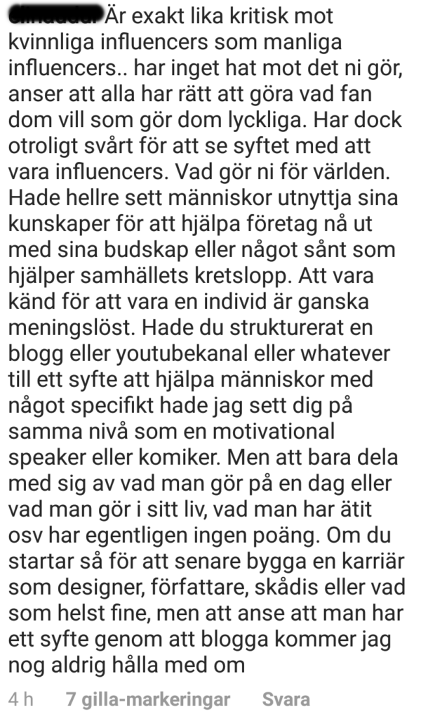 Mycket bra skrivet! Jag tar alltid på mig teflonet och låter all sorts negativitet bara rinna av mig. Negativitet är det värsta jag vet och jag kan inte låta det skapa obalans i min energi. Tänker därför lite i stil med ”vad tråkigt för den som inte tycker influenser är ett yrke”, jag vet bättre.