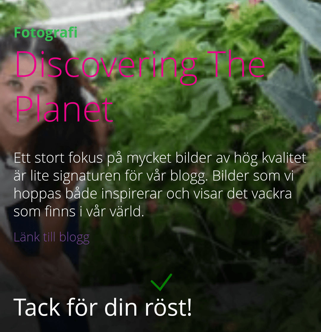 Om ni gillar det vi gör och vill supporta oss får ni gärna lägga en röst på oss. Klicka bara på bilden för att lägga er röst i den kategori ni ser oss gå vidare i… eller rösta gärna på alla :).